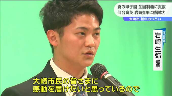 仙台育英・岩崎生弥選手に大崎市から感謝状贈呈「本当に温かいまちだと改めて感じた」宮城 2023年1月4日(水) 18:30 国内 去年、夏の甲子園で全国優勝を果たした宮城県大崎市出身で仙台育英高校硬式野球部の岩崎生弥選手に4日、市から感謝状が贈られました。大崎市民およそ300人が集まった新年のつどいに登場した仙台育英の岩崎生弥選手…