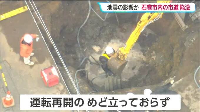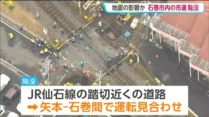 道路陥没で車立ち往生 地震で水道管が破裂し道路陥没か JR仙石線一部区間で運転見合わせ 宮城・石巻市 2026年4月21日(火) 06:08 国内 地震・災害 運転再開のめど立たず 陥没したのはJR仙石線の踏切近くの道路で、仙石線は現在、矢本駅と石巻駅の間で運転を見合わせています。 運転再開のめどはたっておらず、市などが復旧作業を急いでいます。 ▶【画像を見る】道路陥没現場の様子