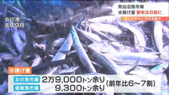 また、女川も2万9000トン余り、塩釜も9300トン余りと水揚げ量は前年の6割から7割に留まっています。一方、水揚げ高は、女川が75億4000万円、塩釜が95億7000万円でともに前年を10億円ほど上回りました。物価高の影響で魚の価格も上がったことが要因です。