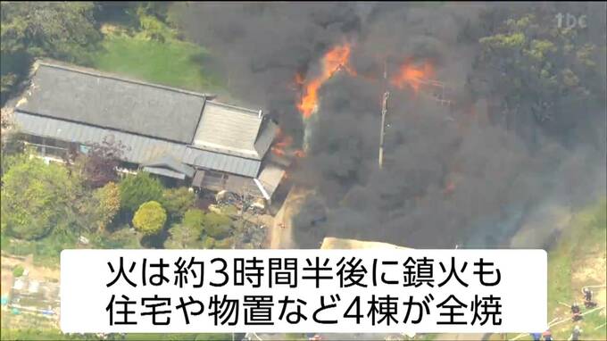 消防がポンプ車など7台を出して消火にあたり、火はおよそ3時間半後に消し止められましたが、住宅や物置などあわせて4棟が全焼しました。
