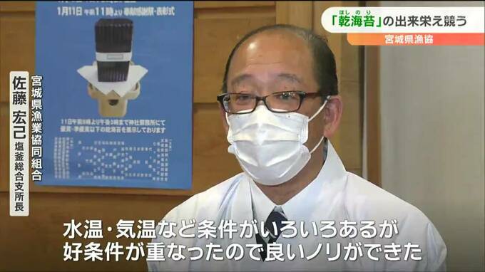 去年12月、低気圧が発生し、漁場に栄養が行き渡ったことなどから、今シーズンは色が黒く、艶があり良い出来になっていて、昨年度より1億枚以上多い4億枚の生産を目指しているということです。