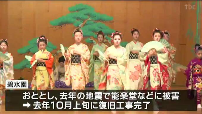 碧水園は、おととしと去年発生した地震の影響で、能楽堂の壁に亀裂がはいるなどの被害を受けましたが、去年10月上旬に復旧工事が完了しました。