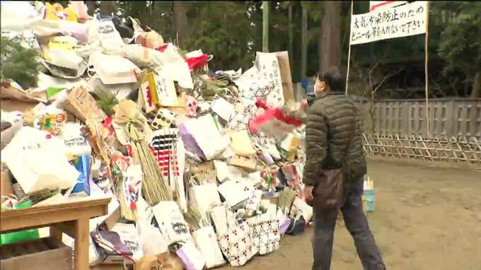 境内には、参拝客が持ち込んだ正月飾りなどが高く積み上げられています。