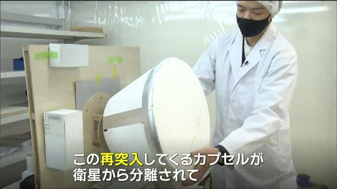 「こちらが私たちが開発しているELS―R100という人工衛星になります。人工衛星の全体が、80センチとかそのくらいの大きさの四角い人工衛星なんですけど、この中にカプセルがはいっていまして、この再突入してくるカプセルが衛星から分離されてこれが宇宙から地球にもどってくる」