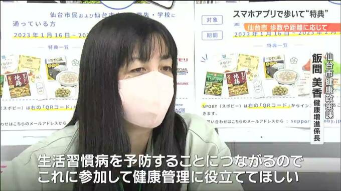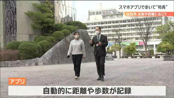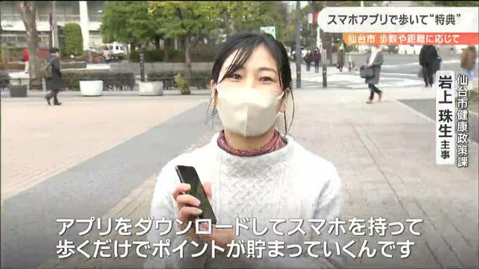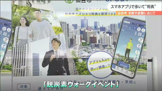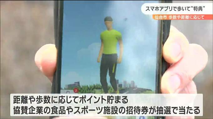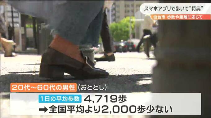 「4719」いったい何の数字でしょうか?これは仙台市内の男性の1日の平均歩数。全国平均に比べて2000歩少なく、仙台市民は肥満の傾向にあると指摘されています。こうした中、仙台市は16日から、スマホのアプリや企業と連動したウォーキングイベントを始めました。歩数や距離に応じてポイントが貯まり、様々な特典がついてくる仕組みです。