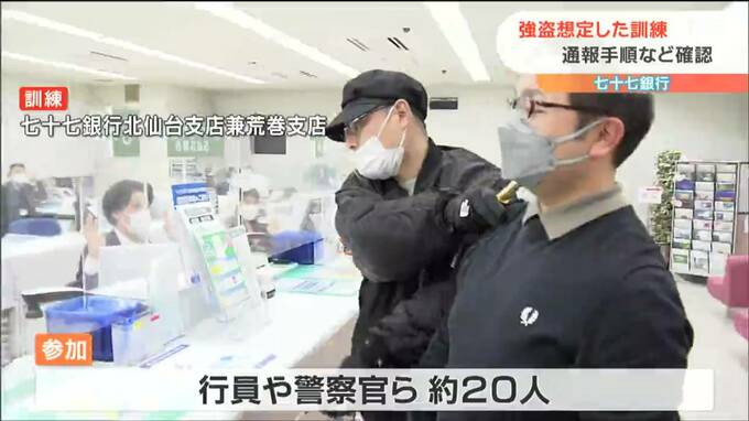 「隙のないような形で」仙台市内の銀行で強盗対応訓練 去年本店で「強盗未遂事件」 2023年1月17日(火) 18:20 国内 強盗事件を想定した訓練が17日、仙台市内の銀行で行われ、行員が犯人への対応や通報の手順などを確認しました。仙台市青葉区の七十七銀行北仙台支店兼荒巻支店で行われた訓練には、行員や警察官らおよそ20人が参加…
