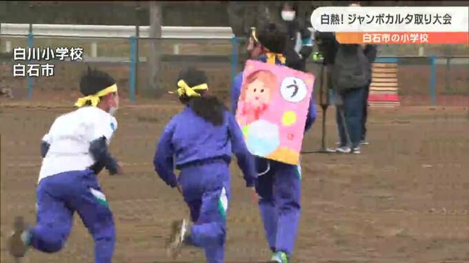 子どもたちが背負った大きな絵札を取り合う、ジャンボカルタ取り大会が24日、宮城県白石市の小学校であり、白熱した戦いが繰り広げられました。