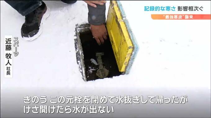 スパーツ・近藤牧人社長「きのうこの元栓を閉めて水抜きをして帰ったんですが、けさ開けたら水が出ないんですね。(Q.これまでこういうことありましたか?)元栓閉めて水が出なかったことはないですね」