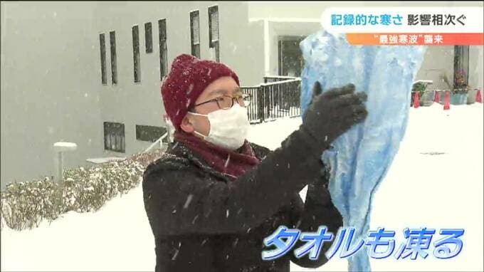 星野誠気象予報士「現在、正午過ぎですが、濡らしたタオルを朝から外に干していたところ、ガチガチに凍り付いています」