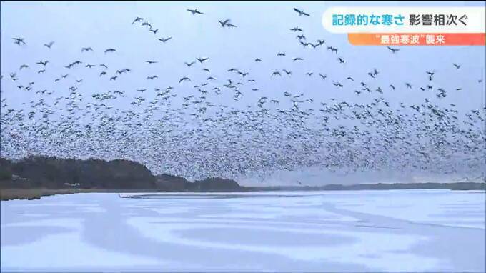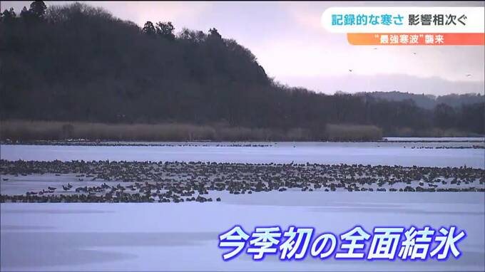 渡り鳥の越冬地、県北部の伊豆沼は気温が急激に下がり始めた24日の午後から凍り始め、25日朝までに、ほぼ全面、氷で覆われました。