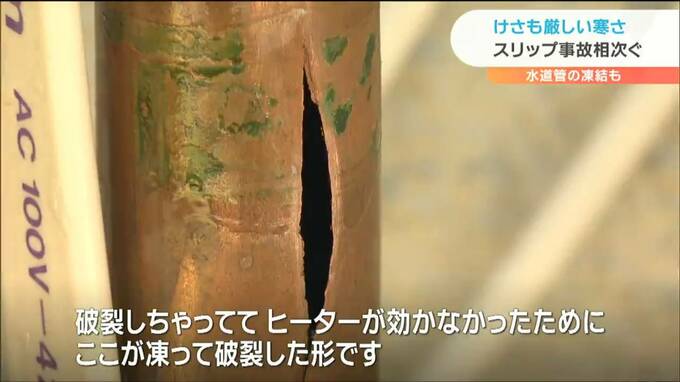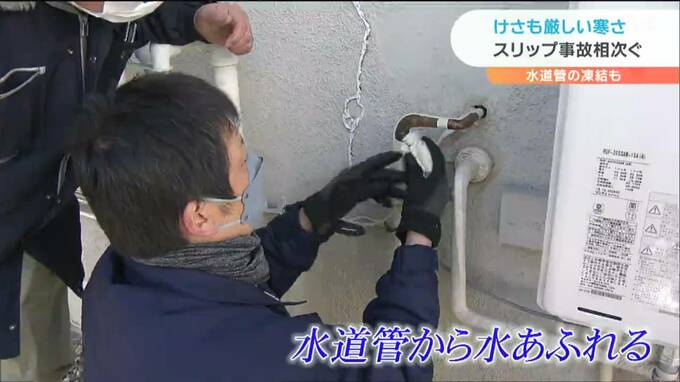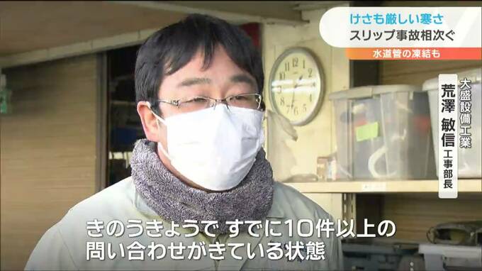 大盛設備工業 荒澤敏信工事部長:「きのうきょうで、すでに10件以上の問い合わせ来ている状態です。凍結で給水管が凍って水が出ない症状とか、凍結によって配管が破裂してしまって水が噴き出しているというのが多いです」
