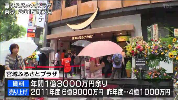 池袋駅東口の宮城ふるさとプラザの賃料は年間で1億3000万円余り。売り上げは2011年度がピークで6億9000万円、昨年度は4億1000万円となっています。
