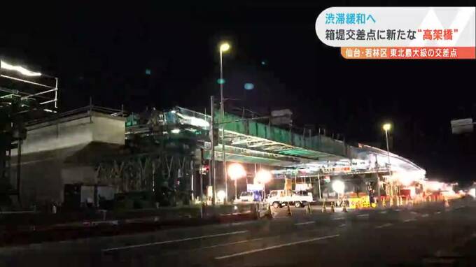 「渋滞緩和へ」東北最大級の国道4号線“箱堤交差点”立体化工事にカメラが密着「一夜で巨大橋が出現」仙台 2023年2月3日(金) 18:20 国内 仙台市若林区にある箱堤交差点で、国道4号線の渋滞を緩和しようと交差点を立体化させるための巨大な橋が架けられました。2日夜から3日朝にかけて行われた東北最大級の交差点の工事にtbcのカメラが密着しました。作…