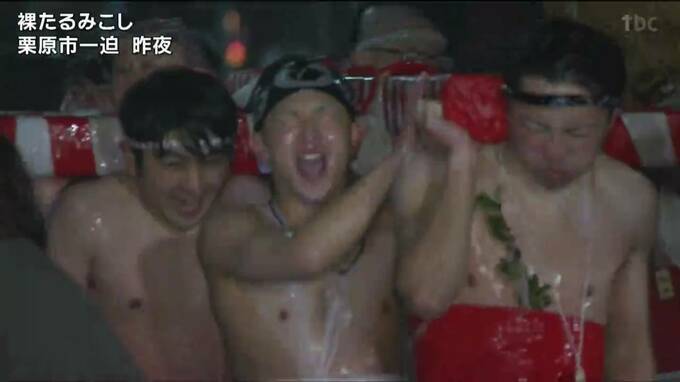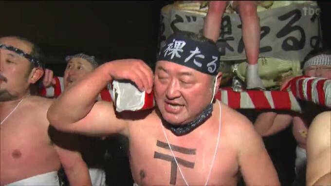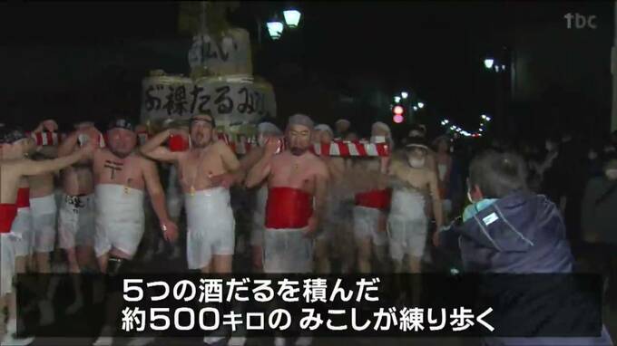 春を呼ぶまつり「裸たるみこし」が3日夜、宮城県栗原市であり、酒だるを積んだみこしがまちを練り歩きました。