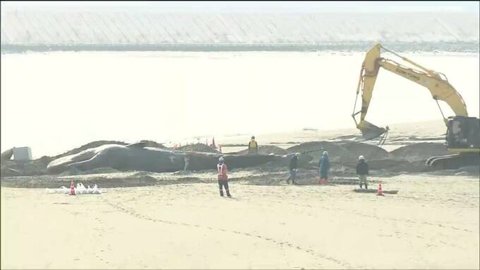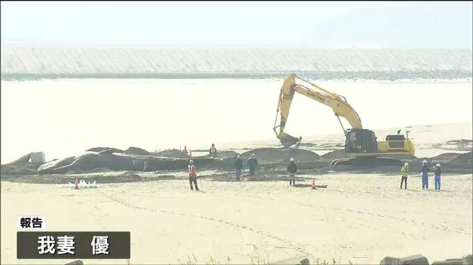 我妻優記者:「クジラの大きな体がいま、重機に引っ張られゆっくりと砂浜へと引き上げられています」
