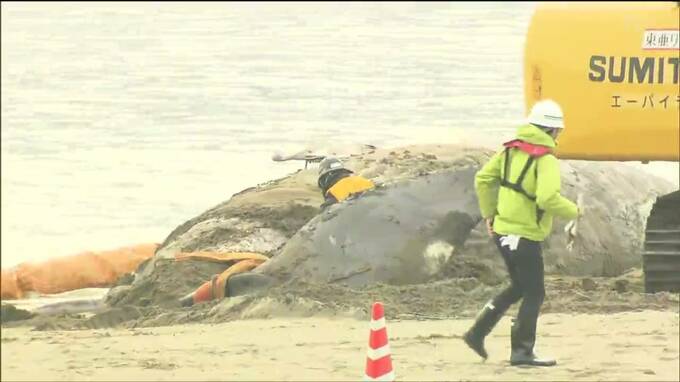 午前8時から行われた作業では市の職員と業者らがクジラを波打ち際から引き上げようと尾びれにワイヤーを巻きつけていきました。