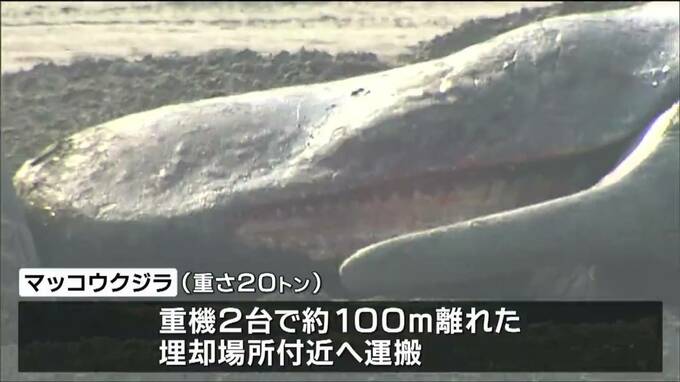 重さ20tと推定されるマッコウクジラは、重機2台によっておよそ100m離れた埋却場所付近まで運搬されました。