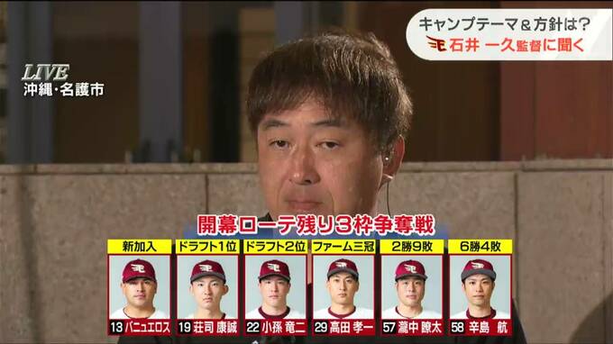 プロ野球、楽天イーグルスのキャンプ地・沖縄からの中継です。最終回のきょうは石井一久監督です。現地から取材を続けている飯野雅人アナウンサーお願いします。