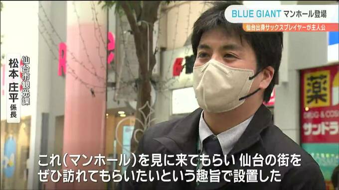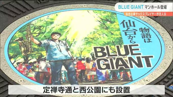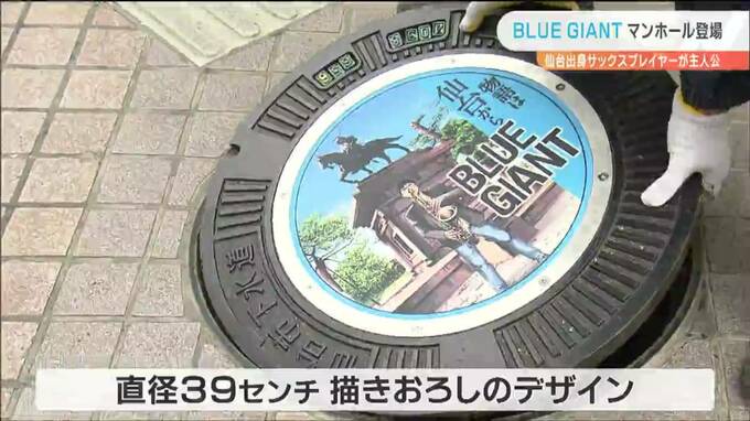 仙台出身のサックスプレイヤーが主人公の人気漫画「BLUE GIANT(ブルージャイアント)」をデザインしたマンホールのふたが、10日、仙台に設置されました。
