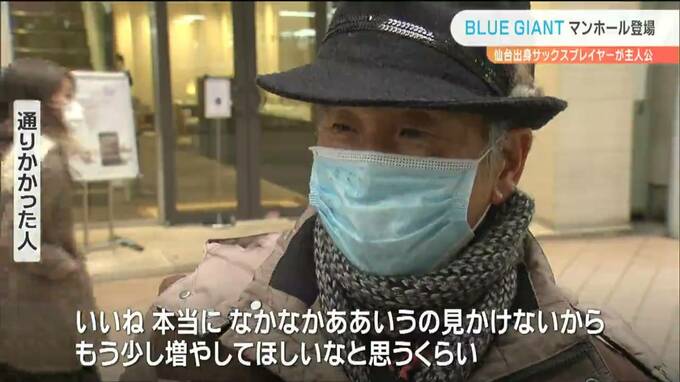 「BLUE GIANT」は仙台出身の主人公が世界一のサックスプレイヤーを目指す人気ジャズ漫画です。このマンホールは2月17日に映画が公開されることを記念して、仙台市が設置したもので、さっそく写真を撮る人の姿が見られました。