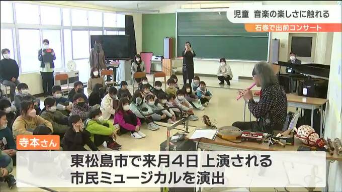 寺本さんは、東松島市で3月4日に上演される市民ミュージカルの演出を手掛けています。大谷地小の関係者が、そのミュージカルに出演する縁から、今回のコンサートが実現したもので、児童たちは一緒に歌を歌うなどして、音楽の楽しさに触れていました。
