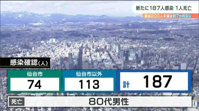 県内で13日、新たに感染が確認されたのは仙台市発表分が▼74人、仙台市以外が▼113人のあわせて▼187人です。また、入院していた80代の男性の死亡が確認されました。
