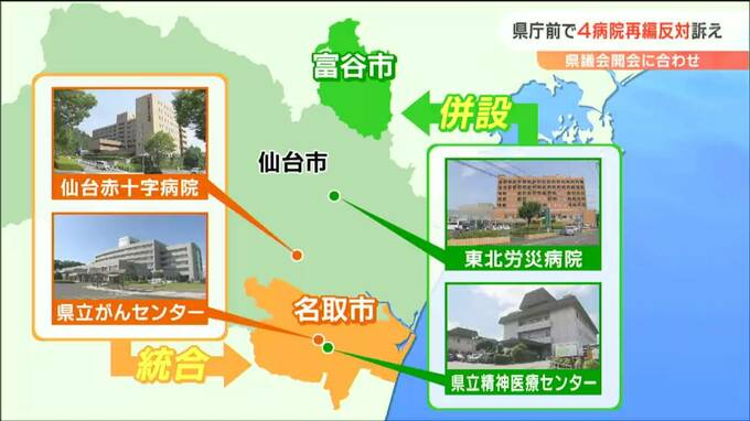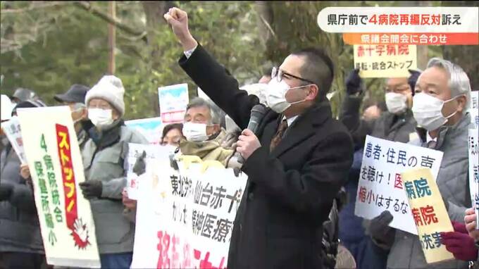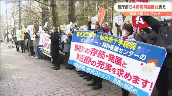 仙台医療圏の4つの病院を2つの拠点に再編する宮城県の構想をめぐり、市民団体などが14日、県庁前で集会を開き、構想への反対を訴えました。