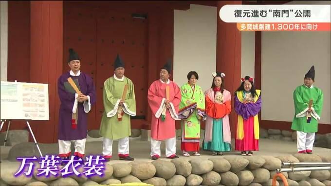 15日は、南門がまもなく完成することから、市長や市の職員が万葉衣装をまとって視察しました。