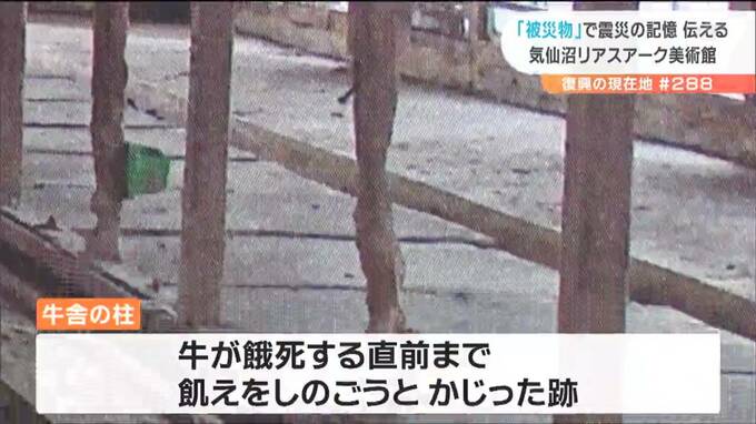 この博物館では4年前、あるオブジェを制作しました。原発事故後、南相馬市の牧場で長期避難を余儀なくされ放置された牛が餓死しました。牛舎の柱には牛が餓死する直前まで飢えをしのごうとかじった跡が残りました。