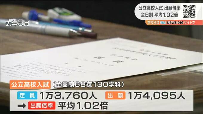 県教育委員会の発表では、公立高校入試は、全日制の68校130学科の募集定員1万3760人に対し、1万4095人が願書を提出し平均の出願倍率は▼1.02倍でした。
