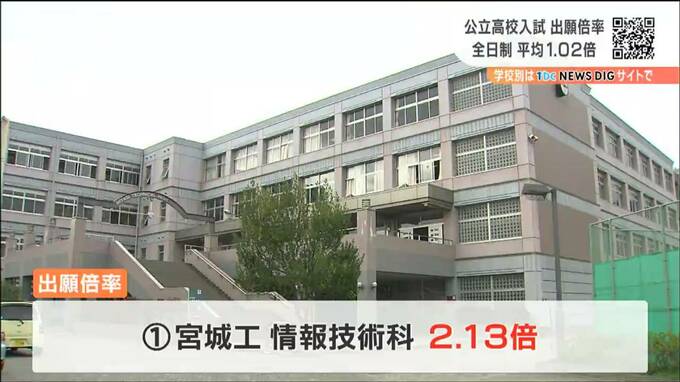 出願倍率が最も高かったのは県工業高校情報技術科の▼2.13倍で唯一2倍を超えています。続いて仙台向山理数科が▼1.93倍、泉普通科が▼1.84倍です。