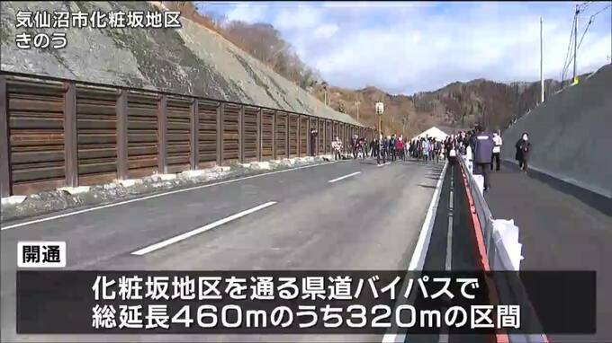 一部開通したのは、気仙沼市の化粧坂地区を通る県道バイパスで、総延長460㍍ののうち320㍍の区間です。