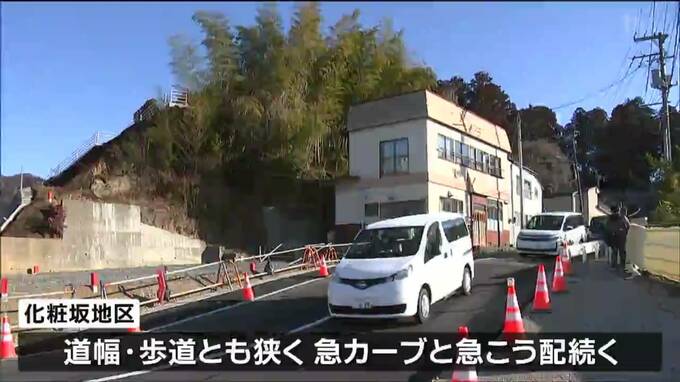 化粧坂地区の県道は、道幅、歩道ともに狭く、急カーブと急勾配が続いています。災害時の第1次の緊急輸送道路になっていることもあり、県では、3年前からバイパス工事を進めてきました。