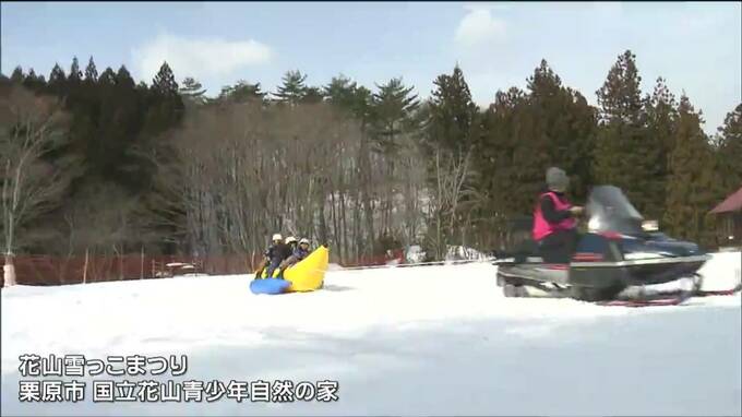 スノーモービルでバナナボートを引っ張ります。宮城県栗原市の「花山雪っこまつり」には、大勢の子どもたちが訪れました。