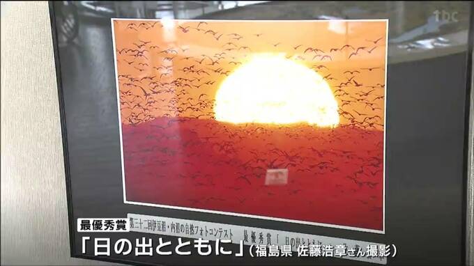 入賞した20の作品のうち、最優秀賞には朝日をバックにマガンの群れが一斉に飛び立つ迫力ある光景を捉えた福島県の佐藤浩章さんの作品「日の出とともに」が選ばれました。