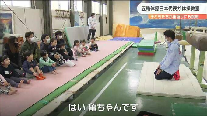 東京オリンピック体操の日本代表で仙台市出身の亀山耕平さんが23日、体操教室の講師を務めました。子どもたちは宙返りにも挑戦するなど楽しみながら体を動かしました。