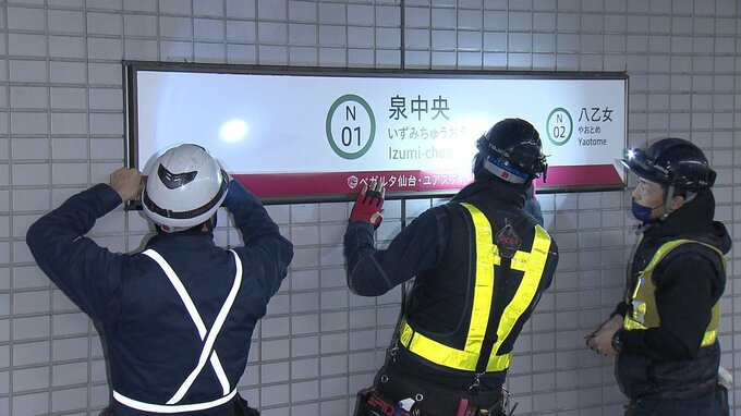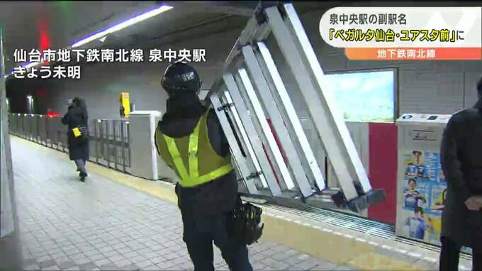 今年春から仙台市地下鉄南北線の泉中央駅に「ベガルタ仙台・ユアスタ前」の副駅名が付くことになり、看板の張り替えが行われました。