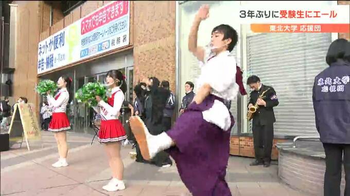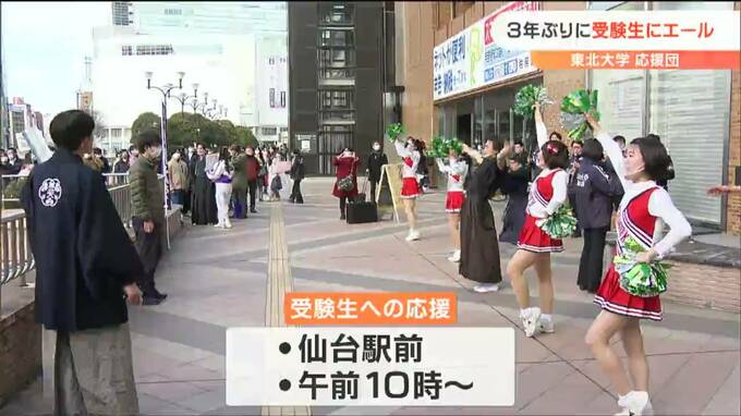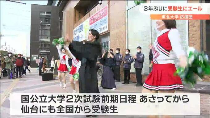 25日から国公立大学の2次試験前期日程が始まるのを前に、仙台駅前では、東北大学の応援団が3年ぶりに受験生にエールを送っています。