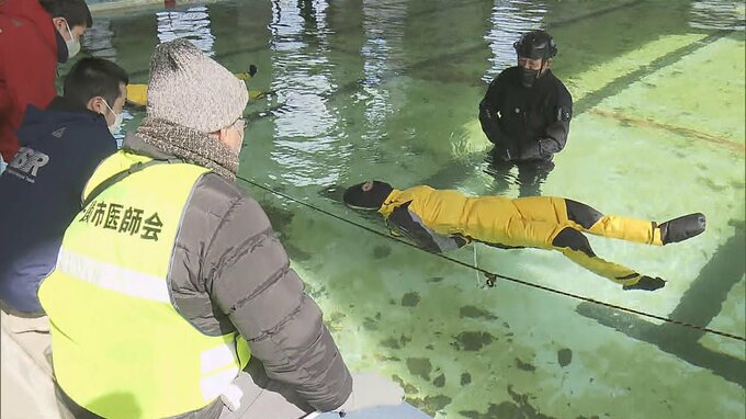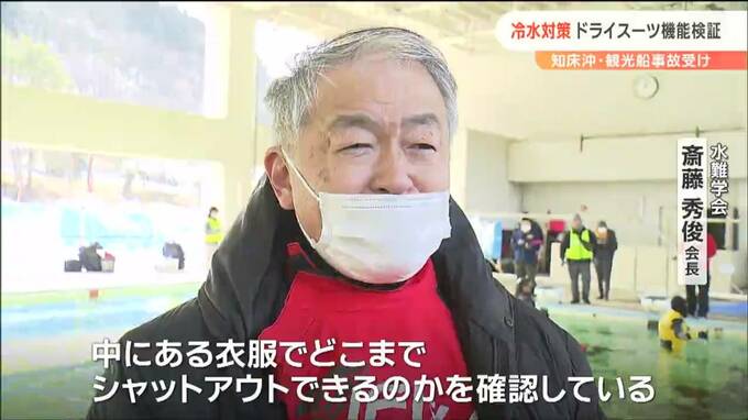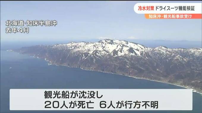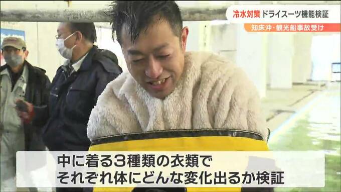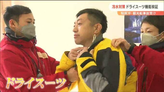 去年4月、北海道の知床半島沖で発生した観光船沈没事故を教訓とした取り組みです。冷たい水から身を守る防水スーツ=「ドライスーツ」の機能を検証する実証実験が27日、宮城県大崎市で行われました。