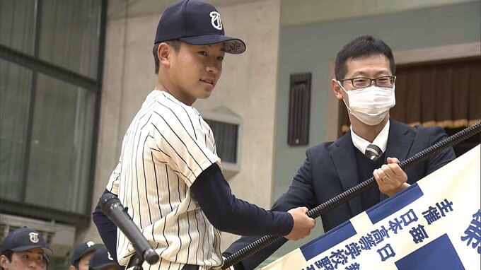仙台育英高校の授与式では、毎日新聞の佐藤丈一仙台支局長が山田脩也主将にセンバツ旗を手渡しました。