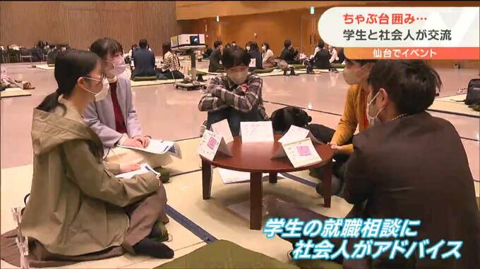 イベントには県内企業16社で働く社会人と就職活動を控えた学生およそ50人が参加しました。グループに分かれてちゃぶ台を囲み、働くことや就職活動の悩みを持つ学生の相談に社会人が本音でアドバイスしました。
