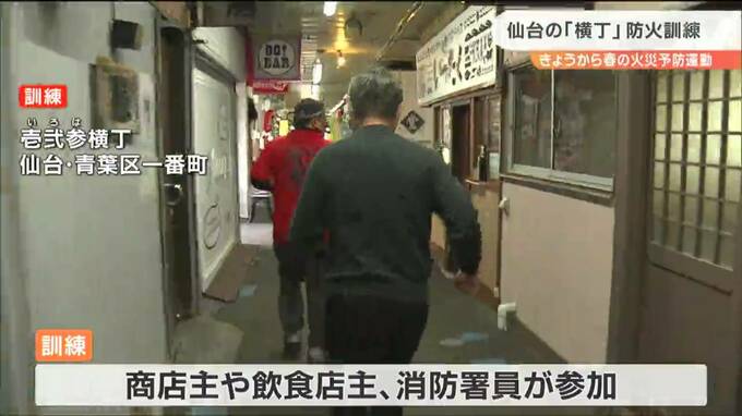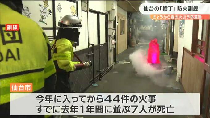 1日から全国で始まった春の火災予防運動に合わせ、仙台市では、狭い路地にある商店街での火災を想定した防火訓練が行われました。