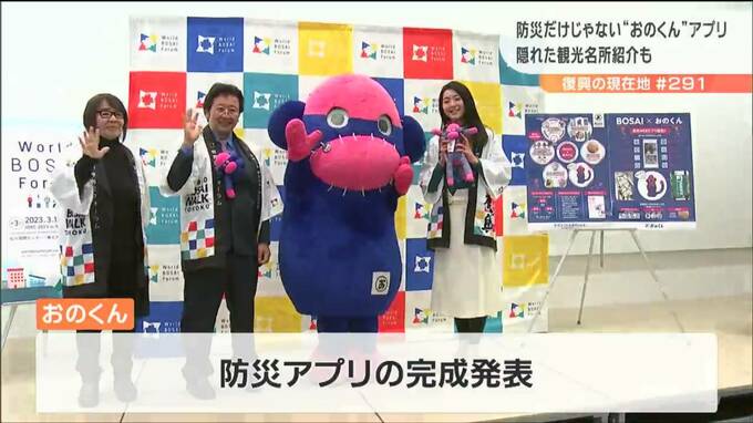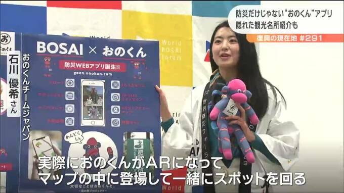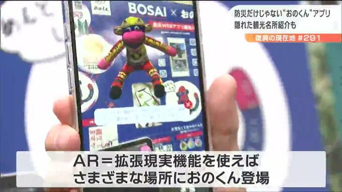 この「おのくん」の防災アプリ。仙台市の企業が開発したものがベースです。アプリにはマップが組み込まれ、災害時の最寄りの避難場所を紹介するほか、AR=拡張現実機能を使えば、様々な場所にオリジナルの「おのくん」を登場させ、写真を撮影するなど楽しむことができます。