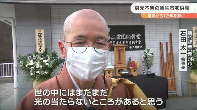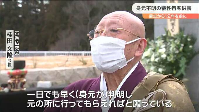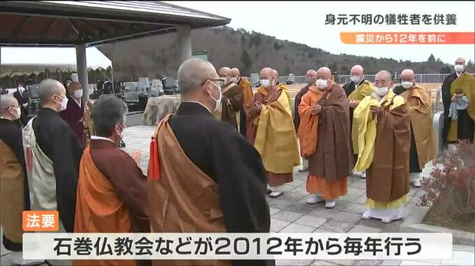東日本大震災の発生から12年を迎えるのを前に供養です。身元が分からない遺骨が納められている宮城県石巻市の霊園で、2日、法要が営まれました。