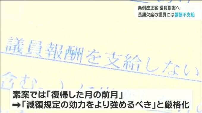 焦点となっている長期欠席した議員への報酬の取り扱いについて、長期欠席した定例会閉会の翌月から復帰した月まで報酬を全額支給しないことでまとまりました。