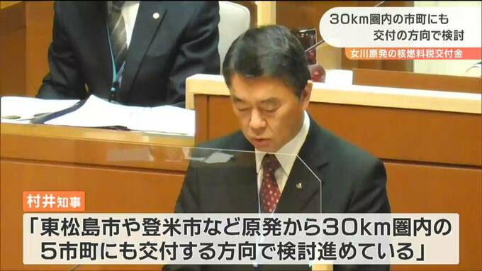 3日の県議会一般質問の答弁で村井知事は初めて「前向きに検討していく」と述べ、東松島市や登米市など原発から30キロ圏内の5つの市と町についても、交付する方向で検討していることを明らかにしました。