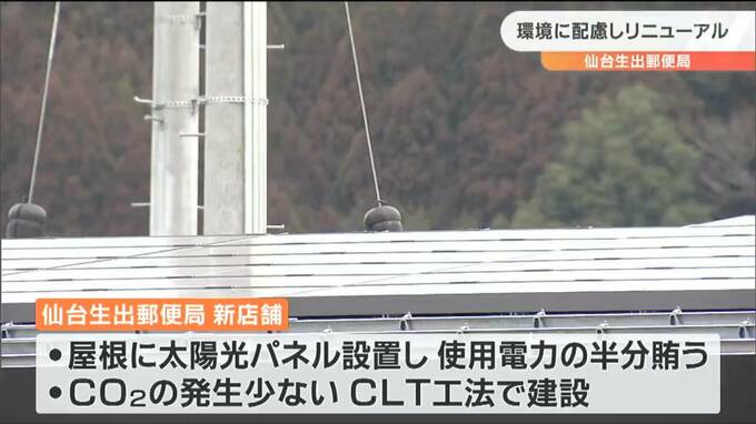 太白区茂庭にある仙台生出(おいで)郵便局は、旧店舗の老朽化に伴い同じ敷地内にリニューアルオープンしました。新店舗は屋根に太陽光パネルを設置し、使用電力の半分をまかなうほか部材として強度が強く材料製造時にCO2の発生が少ない工法で建設するなど、東北で初めて本格的に環境に配慮した作りになっています。