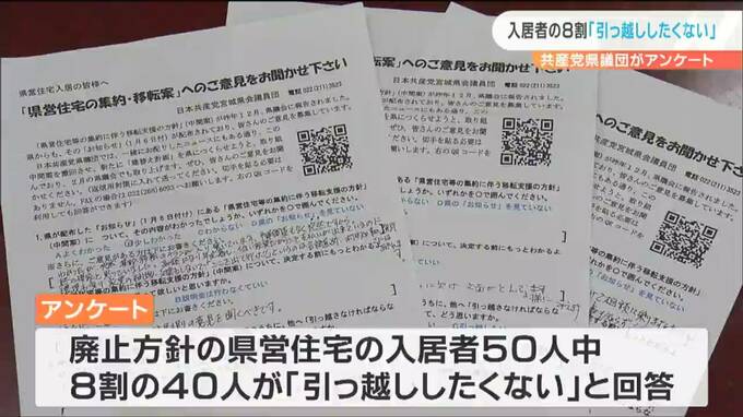共産党県議団が行ったアンケートでは、廃止の方針が示されている県営住宅の入居者50人のうち8割に当たる40人が「引っ越ししたくない」と回答しました。