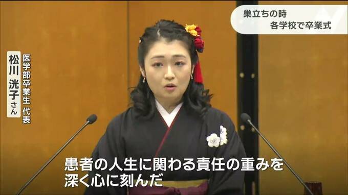 卒業生のうち92人は、医学部が開設された翌年の2017年度に入学した2期生で、「コロナ禍で実習など苦労した経験を将来に役立てたい」と希望を語りました。
