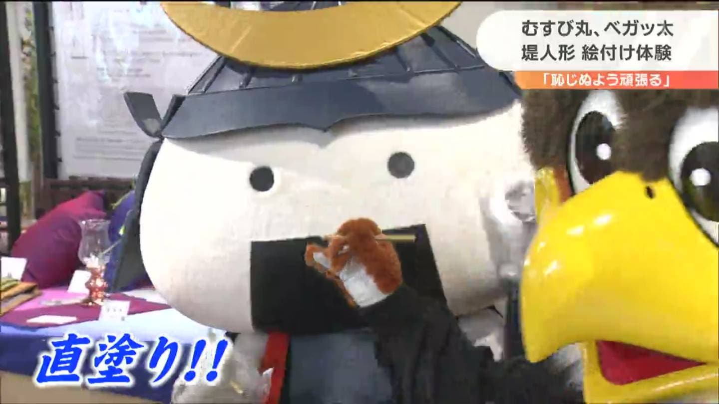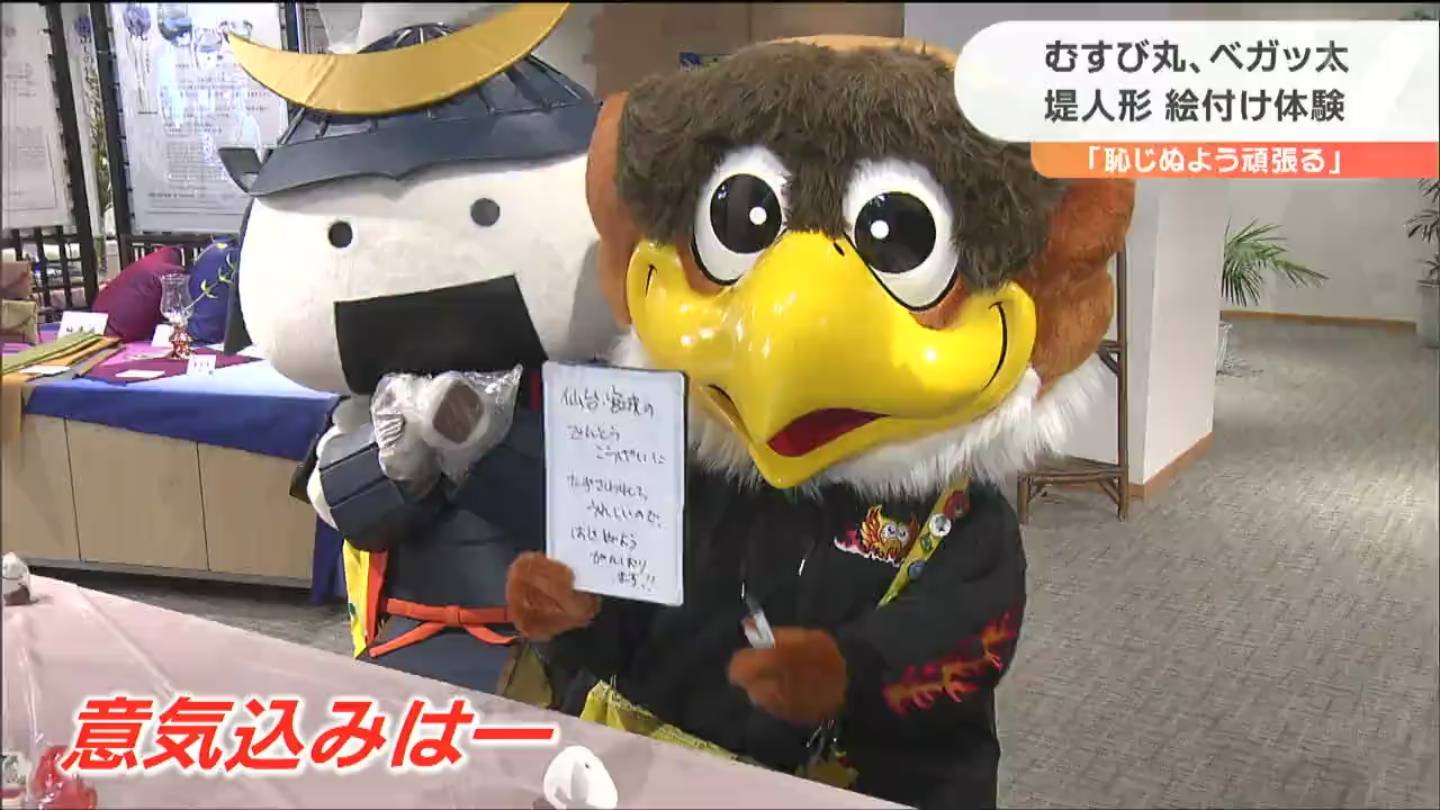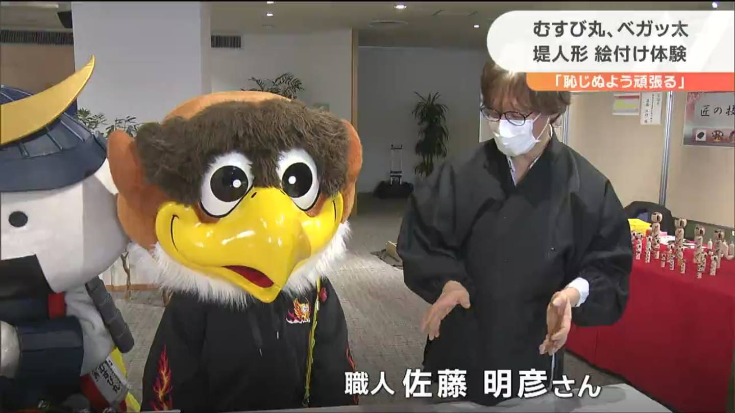 会場では、職人による実演も行われていますが、14日は特別企画としてむすび丸とベガルタ仙台のベガッ太が堤人形の絵付けを体験しました。